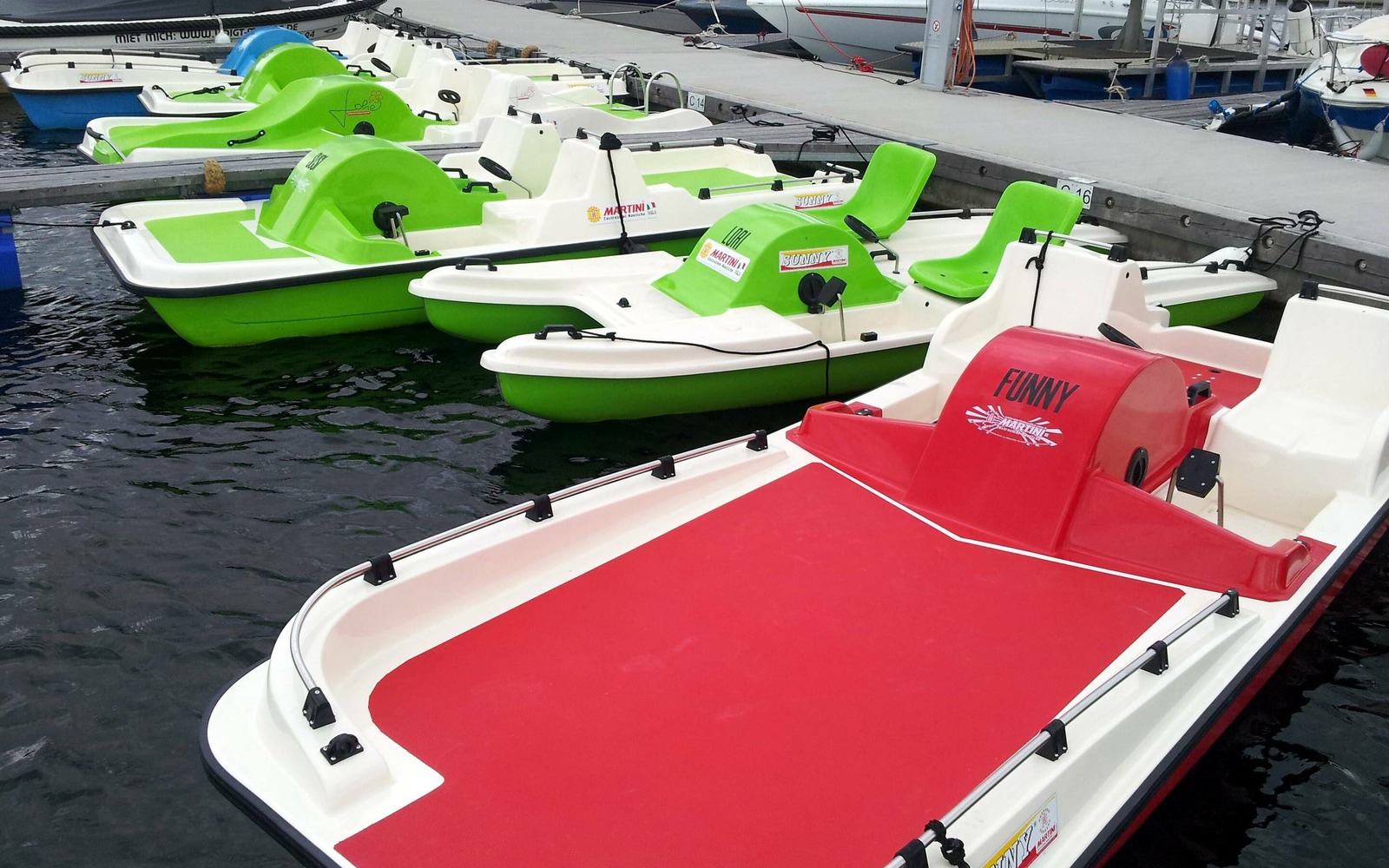 Půjčovna lodí u jezera Senftenberg zahrnuje tři různé typy šlapadel pro ruční ovládání pomocí síly nohou. Některé šlapadla mají potápěčskou nebo opalovací plošinu s žebříkem pro koupání a opalování. Šlapací čluny mají trup katamaránu, a proto se velmi snadno řídí s malým ponorem. Jsou velmi vhodné i pro delší poznávací výlety po jezeře Senftenberg.