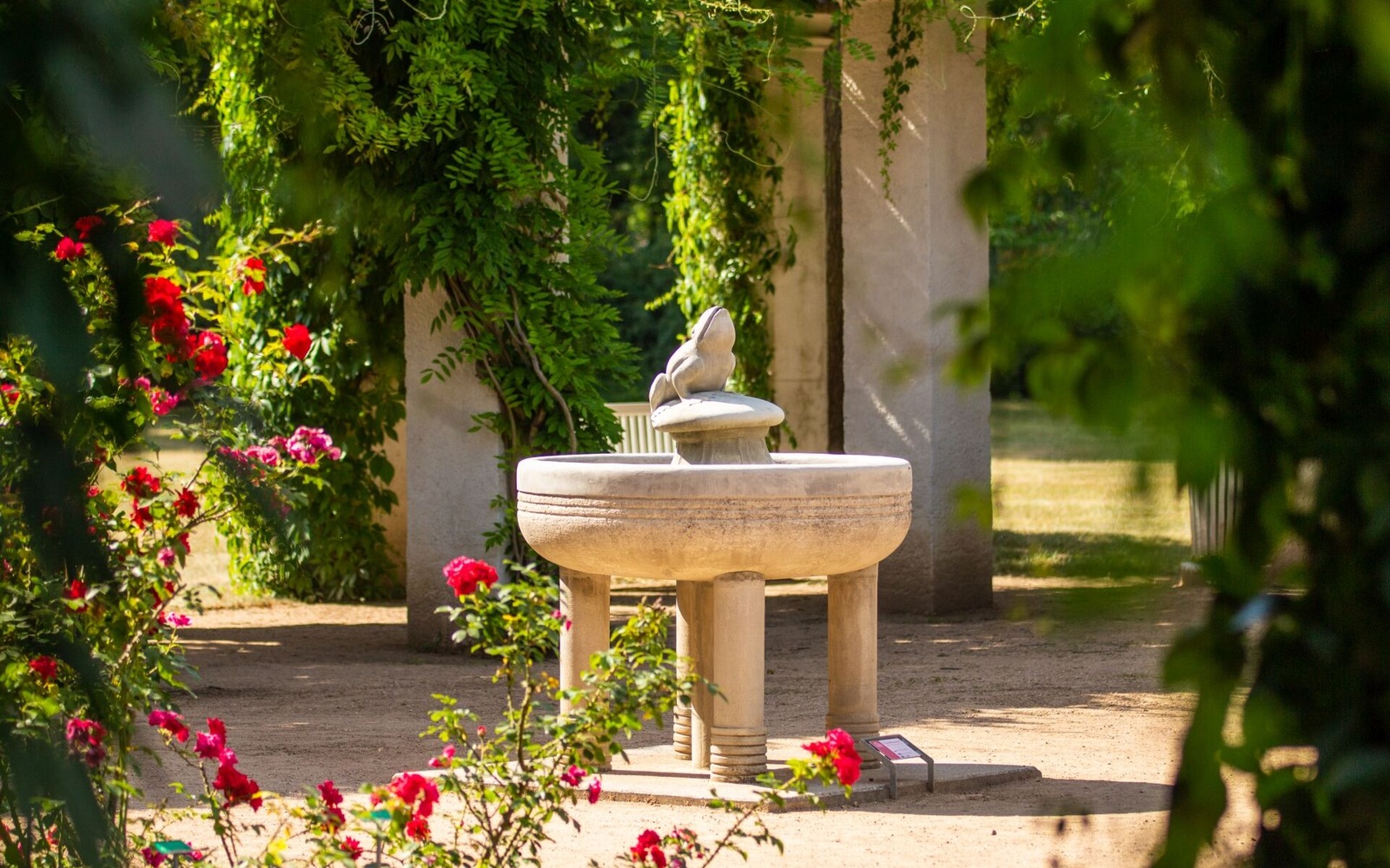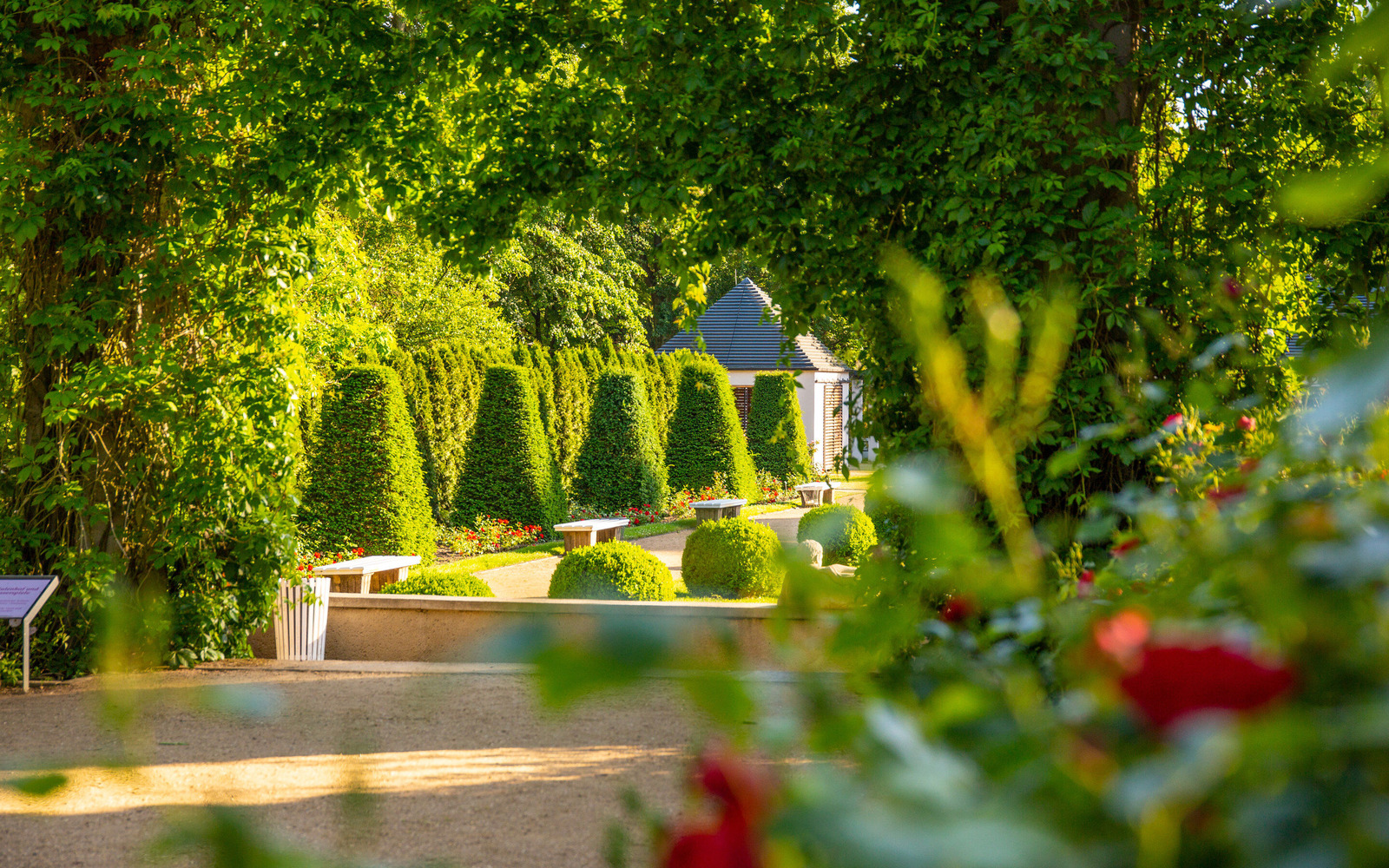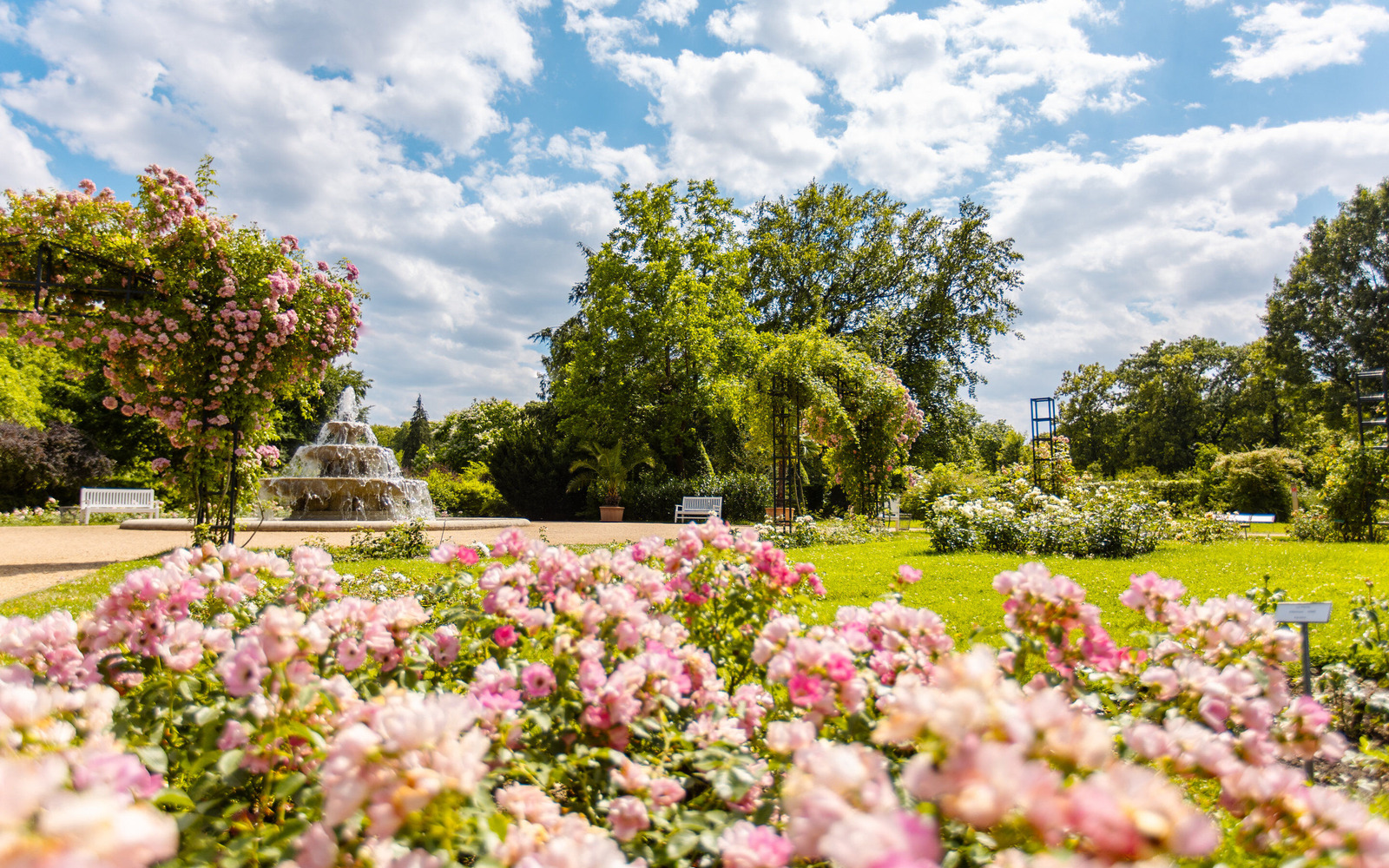 Der Rosenpark hat nicht nur viele verschiedene Rosensorten, die in vielen tollen Farben blühen und unterschiedliche Düfte verströmen. Zwischen den Beeten findet Ihr geheimnisvolle Skulpturen, große Bäume und faszinierende Wasserbrunnen.