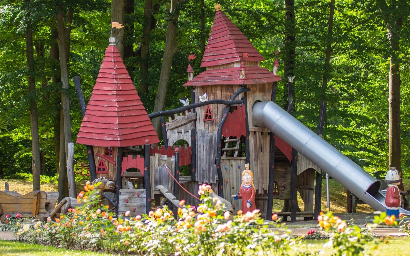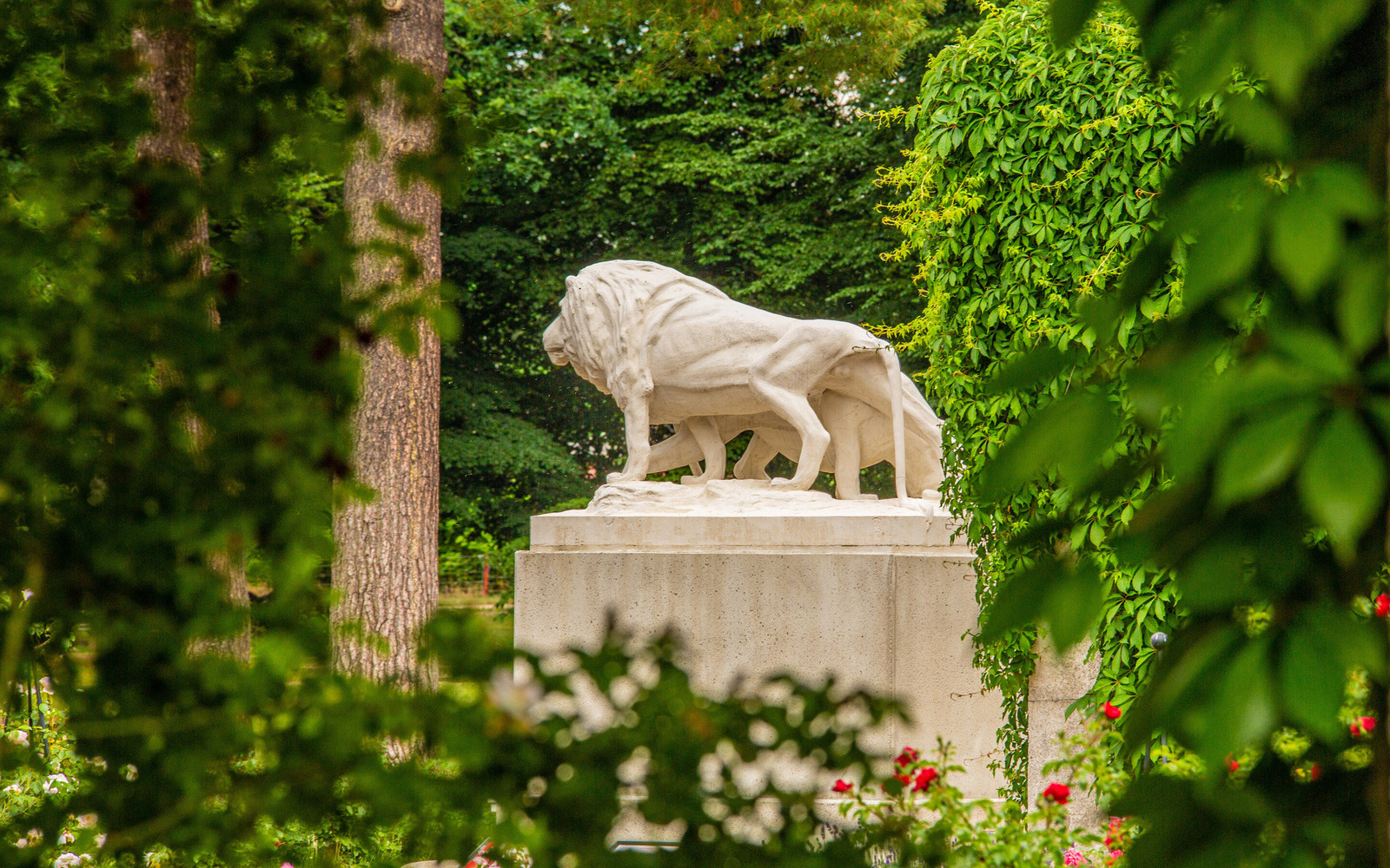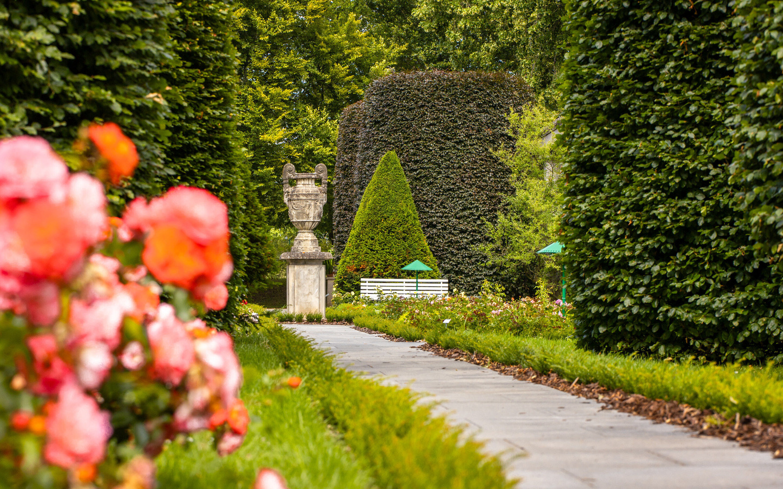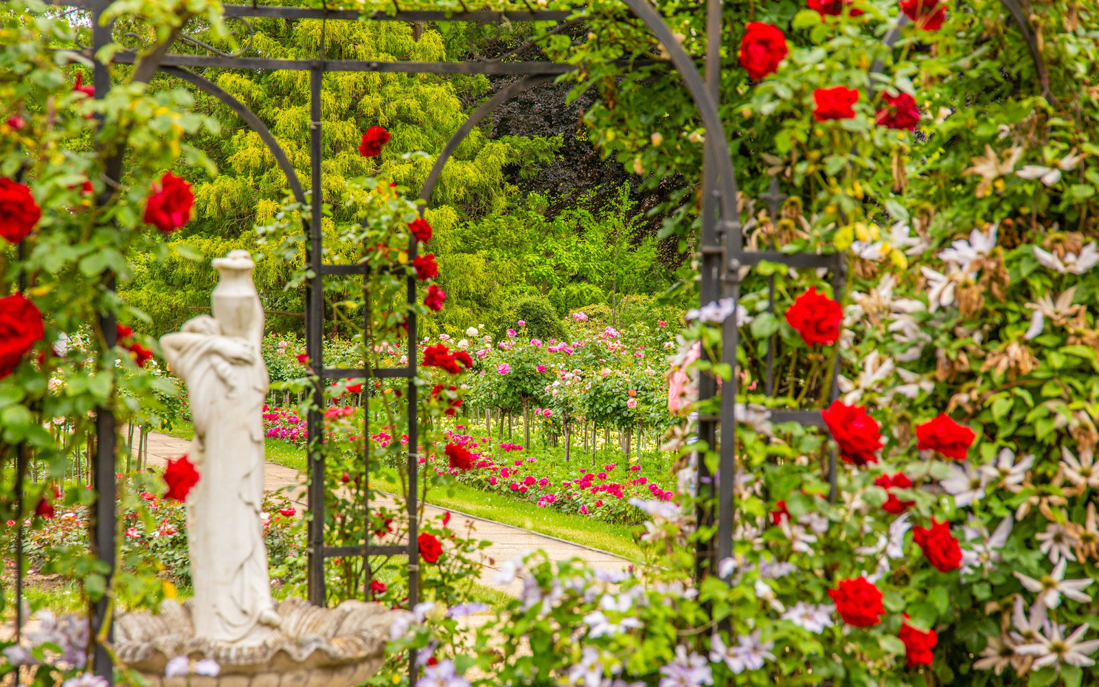 Der Rosenpark hat nicht nur viele verschiedene Rosensorten, die in vielen tollen Farben blühen und unterschiedliche Düfte verströmen. Zwischen den Beeten findet Ihr geheimnisvolle Skulpturen, große Bäume und faszinierende Wasserbrunnen.