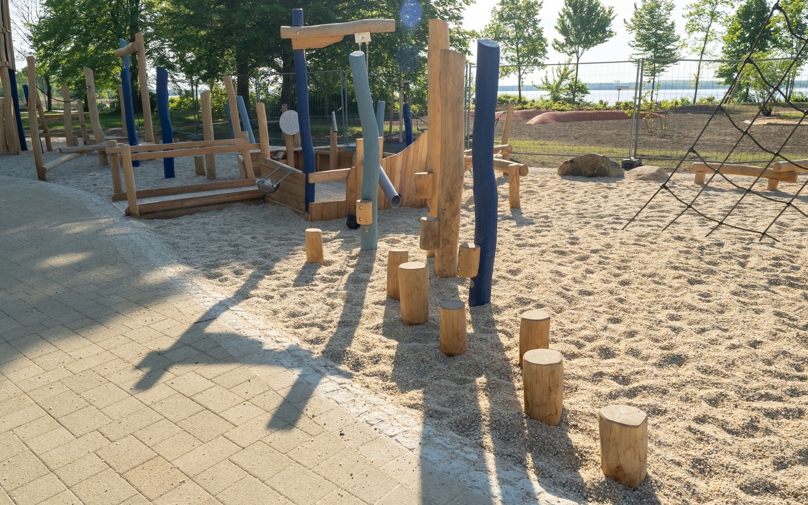 Direkt am Uferweg nahe des Gaumensegels bietet der neugestaltete Themenspielplatz in Senftenberg vielfältige Spielmöglichkeiten mit maritimen und bergbaulichen Bezügen. Im Mittelpunkt steht das bekannte Spielschiff „Bounty“, das neu aufgearbeitet und farblich überarbeitet in die Anlage integriert wurde. Eine ergänzende Flotte, neue Kletterelemente wie Holzfässer sowie eine Seilbahn mit Seeblick erweitern das Angebot. Kleine Hügel symbolisieren Abraumhalden und schlagen thematisch den Bogen vom ehemaligen Tagebau zum heutigen Seenland. Der bestehende Rapunzelturm mit Rutsche bleibt ebenso erhalten wie der benachbarte Rodelhügel. Der Spielplatz verfügt über einen integrativen Bereich und ist durch barrierearme Wege auch mit Kinderwagen oder Rollstuhl gut zugänglich. Mehrere große Findlinge erinnern an Dr. Otto Rindt, einen der maßgeblichen Gestalter des Lausitzer Seenlandes. Der nächste Badestrand liegt nur wenige hundert Meter entfernt östlich des Spielplatzes.