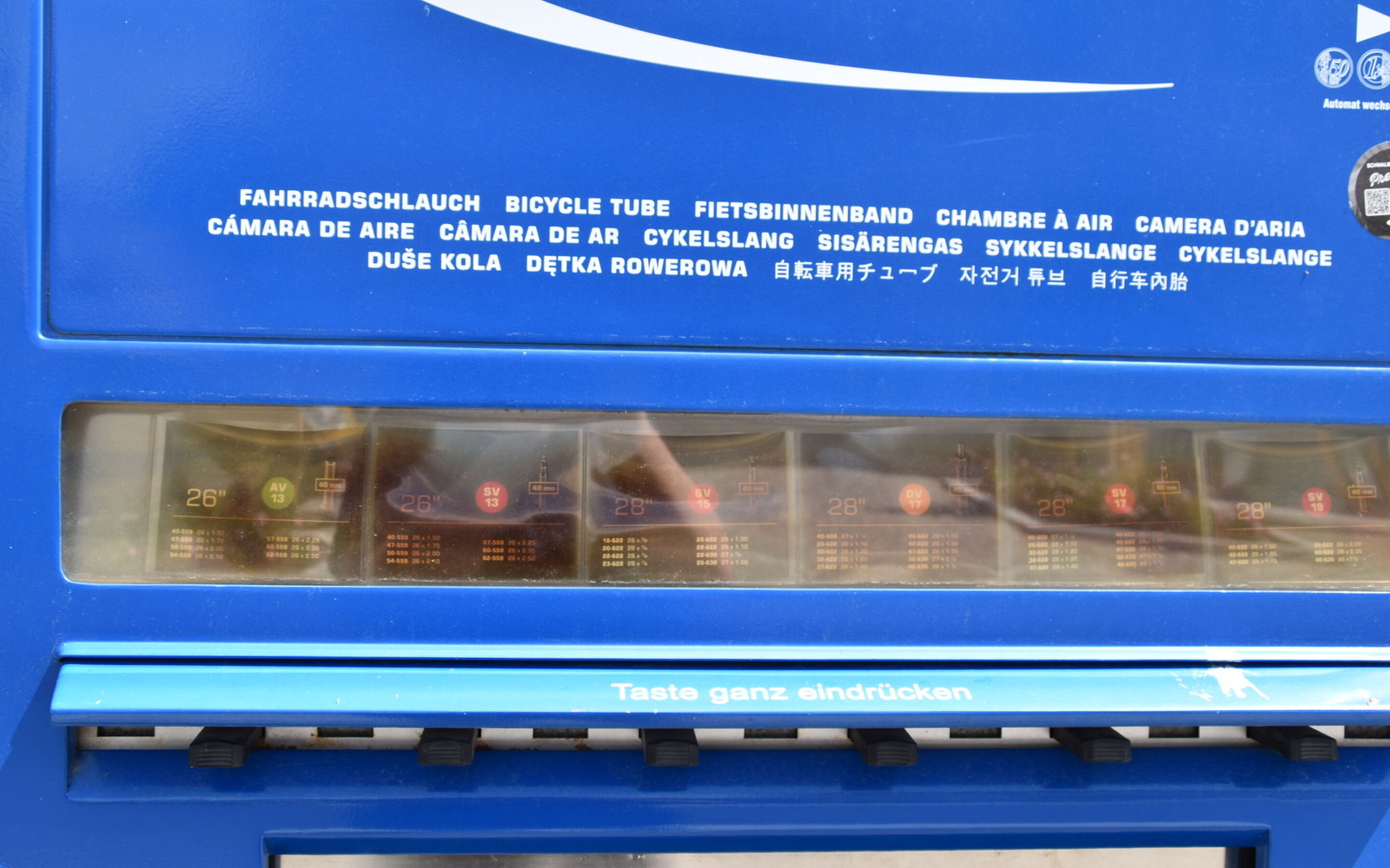 Der Schlauchautomat befindet sich an der Außenfassade des Fahrradgeschäfts Zweirad-Center Lieske in Guben. Rund um die Uhr sind dort Fahrradschläuche in verschiedenen Größen erhältlich.