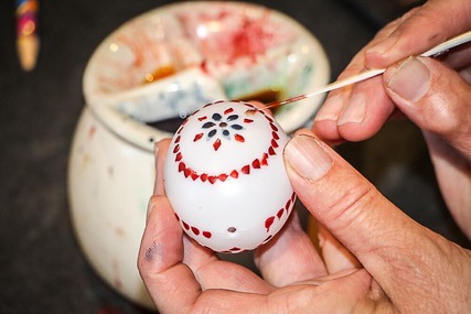 Mit Stecknadelköpfen und heißem Wachs entstehen bunte Muster auf dem Ei. In der offenen Ostereierwerkstatt probiert ihr die traditionelle sorbisch-wendische Technik des Eier Bossierens aus.