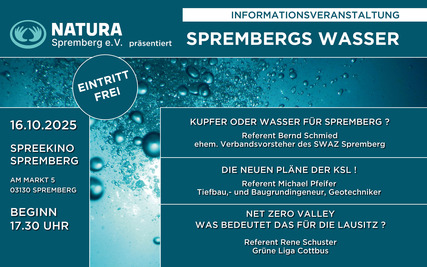 NATURA Spremberg e. V. lädt zu einer öffentlichen Informationsveranstaltung ein. Im Mittelpunkt steht die Zukunft des Wassers in der Region Spremberg. Fachleute geben Einblicke in aktuelle Entwicklungen rund um den geplanten Kupferabbau durch die KSL, die mögliche Rolle der Lausitz als Net Zero Valley sowie die Auswirkungen auf Umwelt und Infrastruktur. Die Veranstaltung richtet sich an Bürger, die sich über Chancen, Risiken und regionale Veränderungen informieren möchten. Ziel ist es, fundiertes Wissen verständlich zu vermitteln und den offenen Austausch zu fördern.