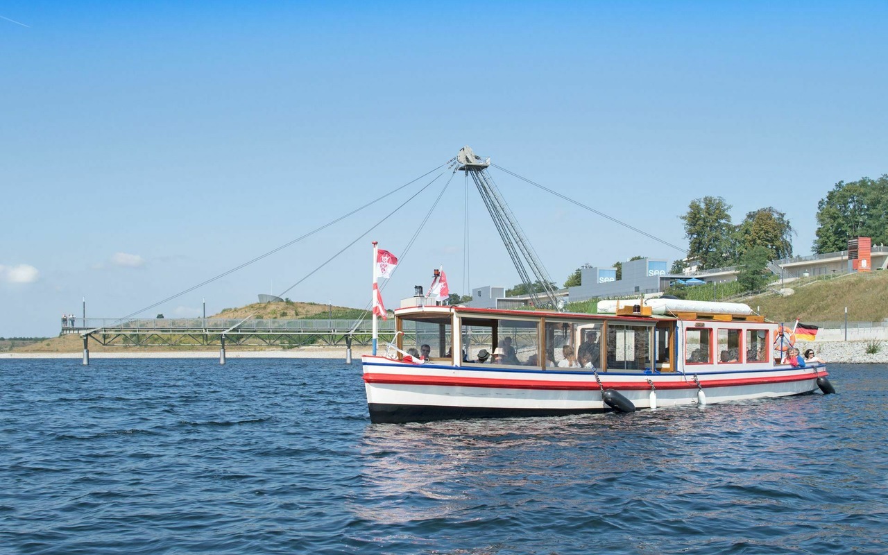 Mit dem Ausflugsschiff gemütlich über die neuen Seen schippern und die Aussicht aufs Wasser genießen.