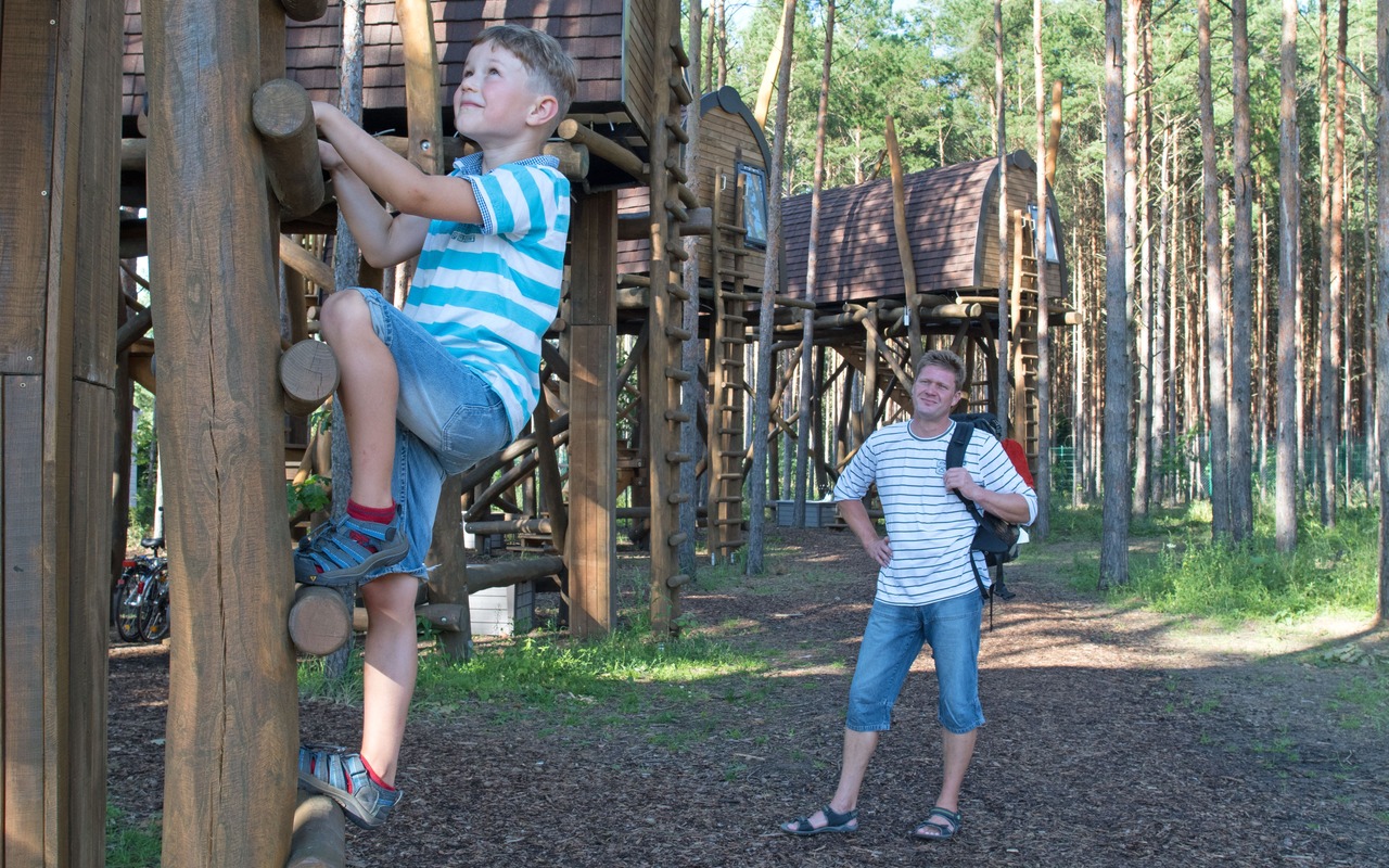Bildunterschrift: Das passende Basislager für den Vater-Sohn-Urlaub im Lausitzer Seenland bieten die gemütlichen Baumhäuser am Hafencamp Senftenberger See.