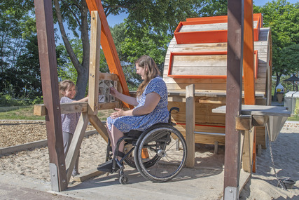 Mutter mit Kind auf inklusivem Themenspielplatz am Senftenberger See