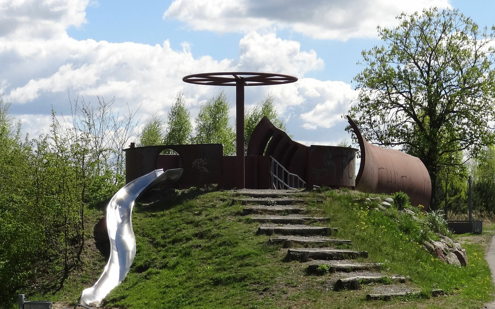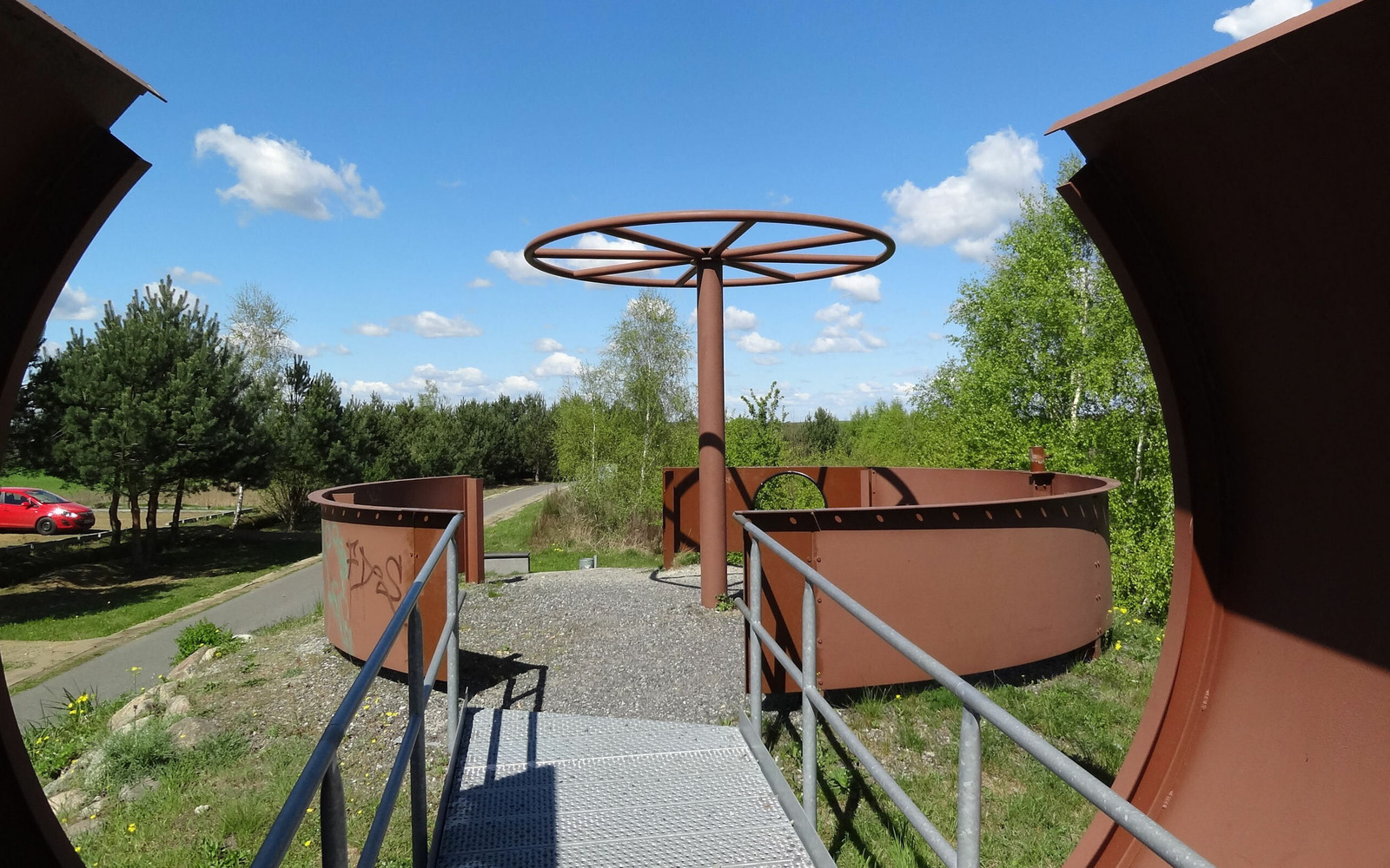 The viewpoint “Randriegel” by the lake Altdöberner See, is a memorial to the region’s mining past and it allows for unobstructed views of the lake that is currently being flooded. The viewpoint’s design resembles an oversized type of drainpipe that is used in surface mining and called a “Randriegel” in German. Inside the pipe, there are information panels about the drainage process, the restructuring work that visitors can experience and the development of the lake Altdöberner See.
