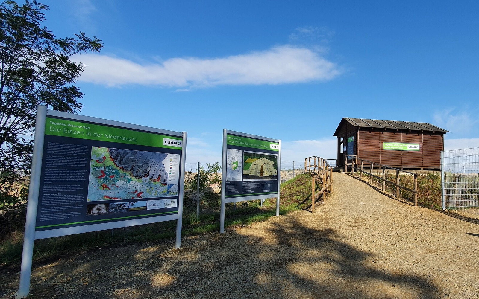 The “South” viewpoint is located south-east of the town of Welzow. From the small viewing house a unique view of the active Welzow-Süd surface lignite mine can be enjoyed. Information boards on the geology of the region, the technology used in surface mining and other tourist attractions in the town of Welzow are a source of additional helpful information at the lookout point.