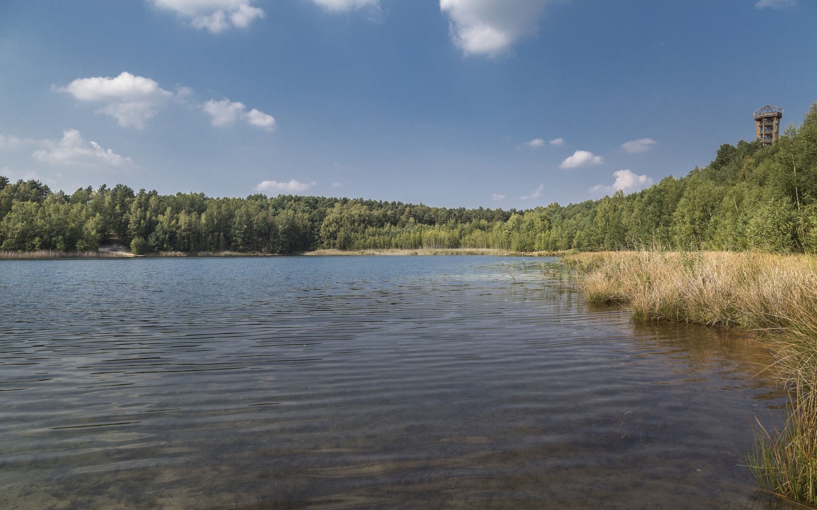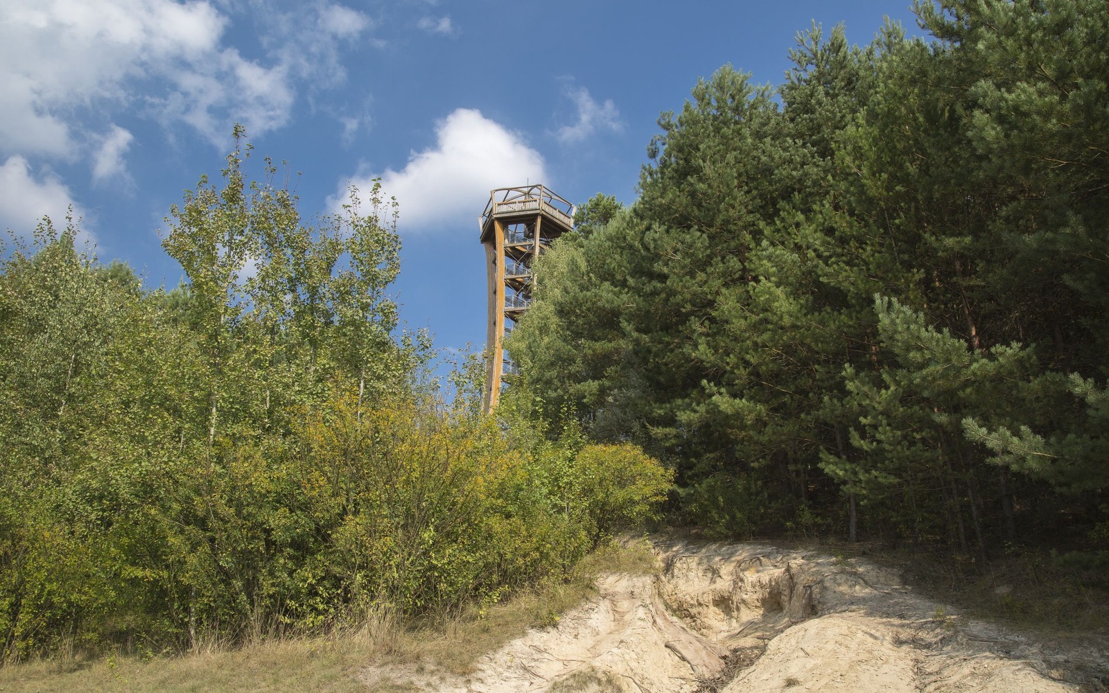 A 36 metres tall observation tower is located on the lakeshore of Felixsee near Bohsdorf and in the heart of the UNESCO Global Geopark Muskauer Faltenbogen. The tower consists of a wood and steel structure and it was opened on October 16, 2004 (about 6.5 months after the foundation stone had bee laid). Construction cost about Euro 360,000. There are three platforms at heights of 4.5, 7.5 and 30 metres (191 metres above sea level). On the first two platforms there are various information panels about the region and its geological history.
