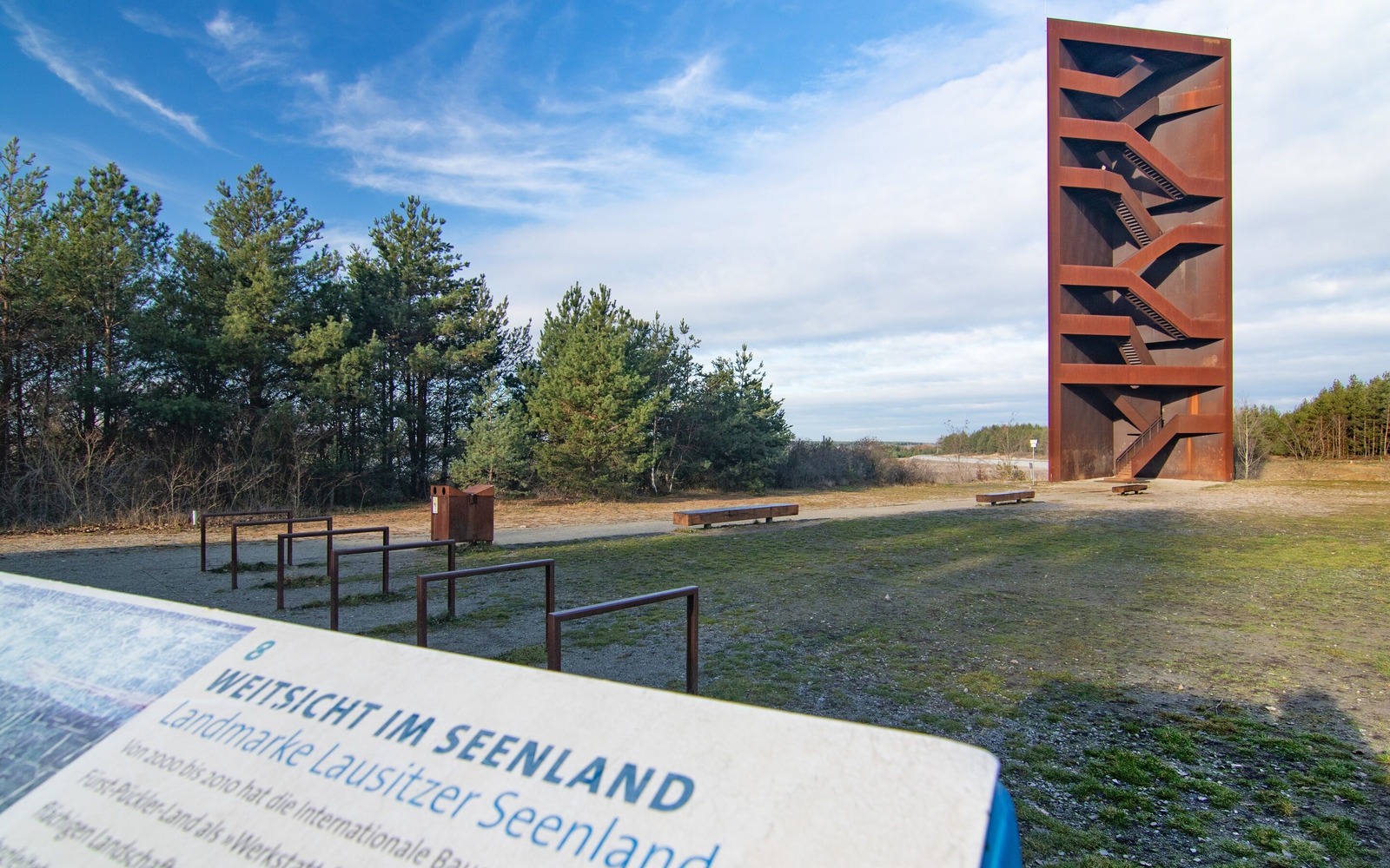 The Lausitzer Seenland Landmark is better known to the locals as the “Rusty Nail”. Located at the point where the Sornoer Kanal opens into Lake Sedlitzer See, the “rusty” observation tower has become one of the most popular destinations in the Lusatian Lake District. The striking architectural creation in rust-red corten steel represents the region’s transformation from a mining area to a place with a new future. The tower stands 30 metres high. It is an ideal rest area for walkers, cyclists and skaters and also offers an impressive panoramic view of the expansive lakeland scenery – making it ideal for observing the development of the Lusatian Lake District. From the viewing platform, it is possible to see Lake Sedlitzer See, Lake Geierswalder See and Lake Partwitzer See.