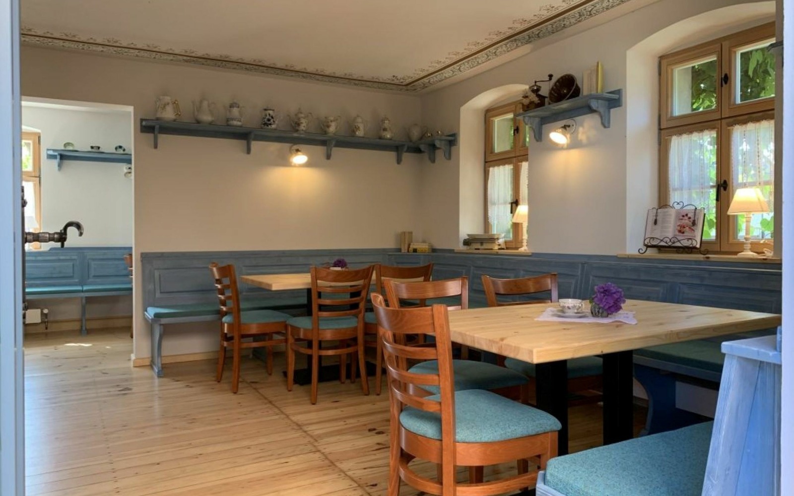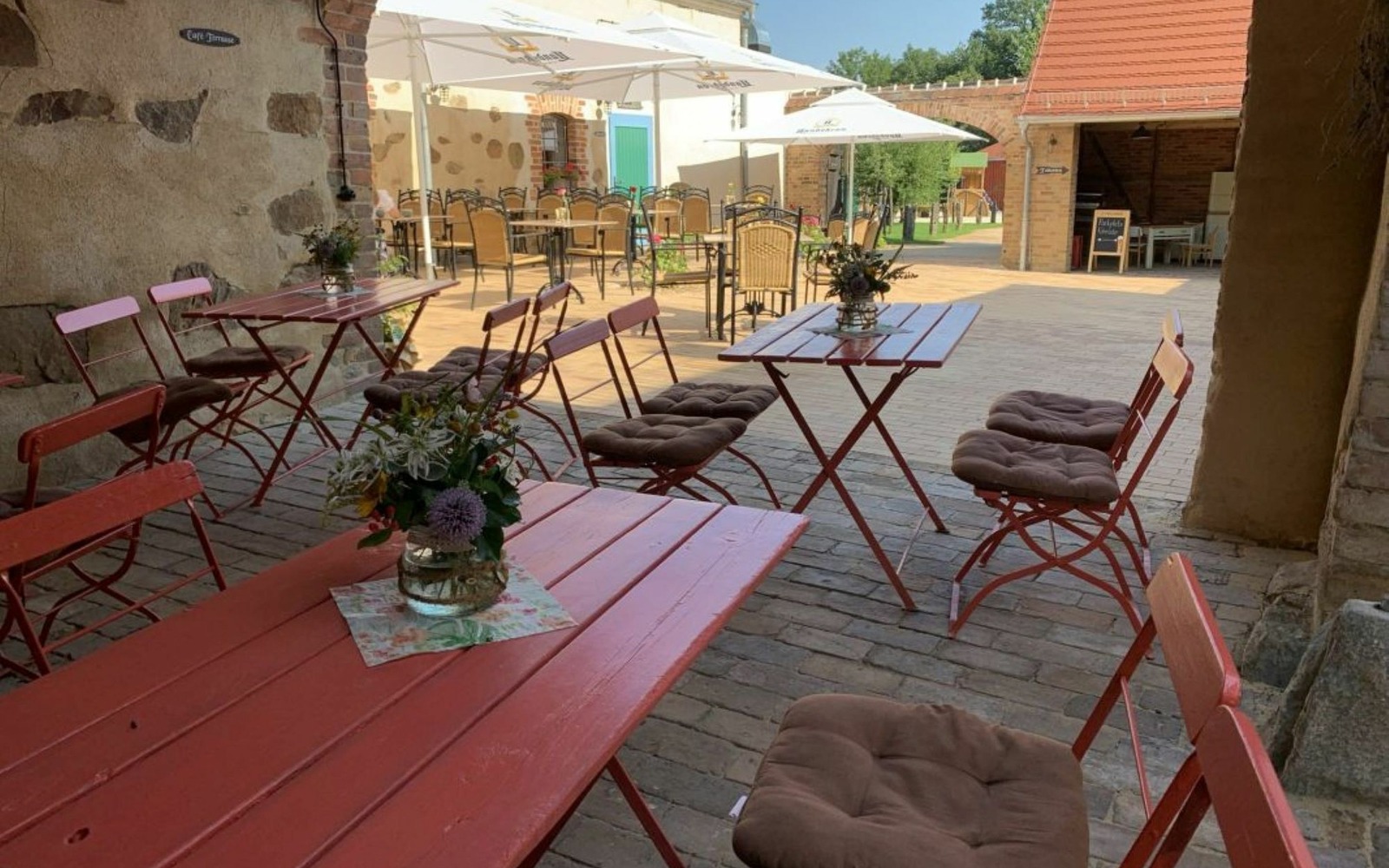In the cozy, separate cafe in the Sonnenhof 1864, you can switch off from everyday life in a rustic ambience and discover decorative pieces rich in detail from a bygone era. From the farm's own bakery and confectionery you can enjoy sweet or savory, creamy or the famous freshly baked buttermilk lentils. The newly created café is located in the Großkoschen district of Senftenberg. A total of 20 seats inside and 20 seats on the terrace in the covered courtyard are available.