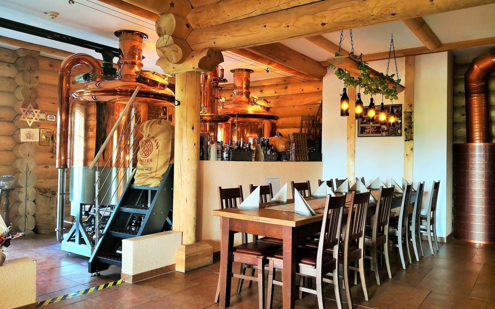 The restaurant serves traditional fare, such as variations of schnitzel, fish dishes and steaks. Fresh in-house brewed beer is served with it. There is also a menu with selected wines available for guests. The restaurant is accessible to wheelchair users.