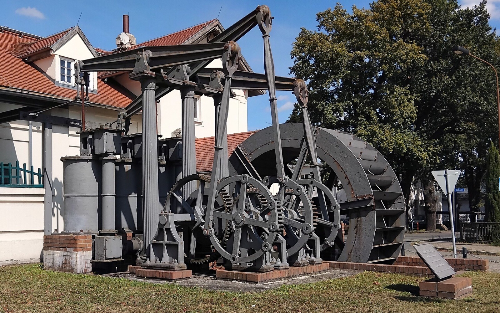 The balancing cylinder blowing machine at the entrance to the Werkhof was manufactured in Lauchhammer in 1837 for a smelting works in Saxony. The 30-ton technical monument was returned to Lauchhammer in 1929. Then as now, the machine impresses with its huge swinging levers and the water wheel with a diameter of 4.40 meters.