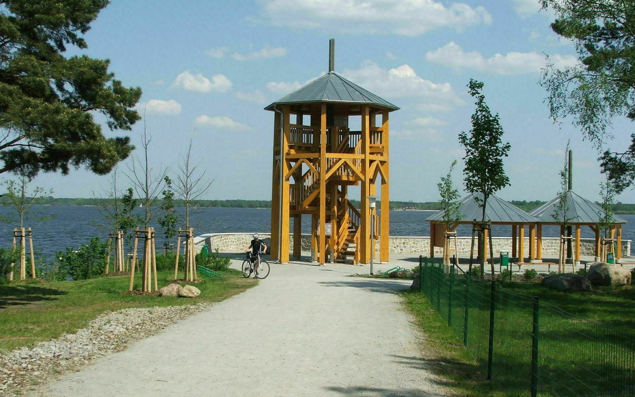 At 19 kilometres, the route around Spremberg reservoir is the longest loop trail in the Lusatian Lakeland. This is hardly surprising, given that Spremberg reservoir is the fourth-largest reservoir in Germany, and the only one in the state of Brandenburg. The route around the reservoir is lined with pines. The expanse of water is broken up by a number of coves and islands, with the trail winding along the shoreline at times.
