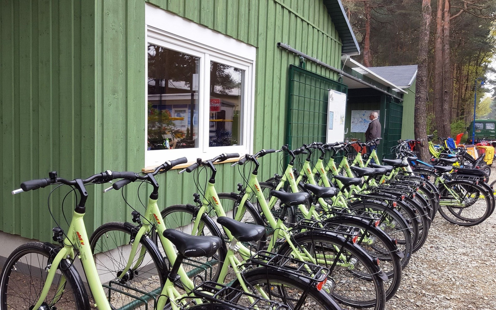 Bicycle rental station at Lake Senftenberg located in Family Park in Großkoschen. The bike centre rents bicycles for adults and childrens, child seats and trailers, e-bikes, tandem bikes and a combined bike/wheelchair plus many different pedal cars and go-karts.