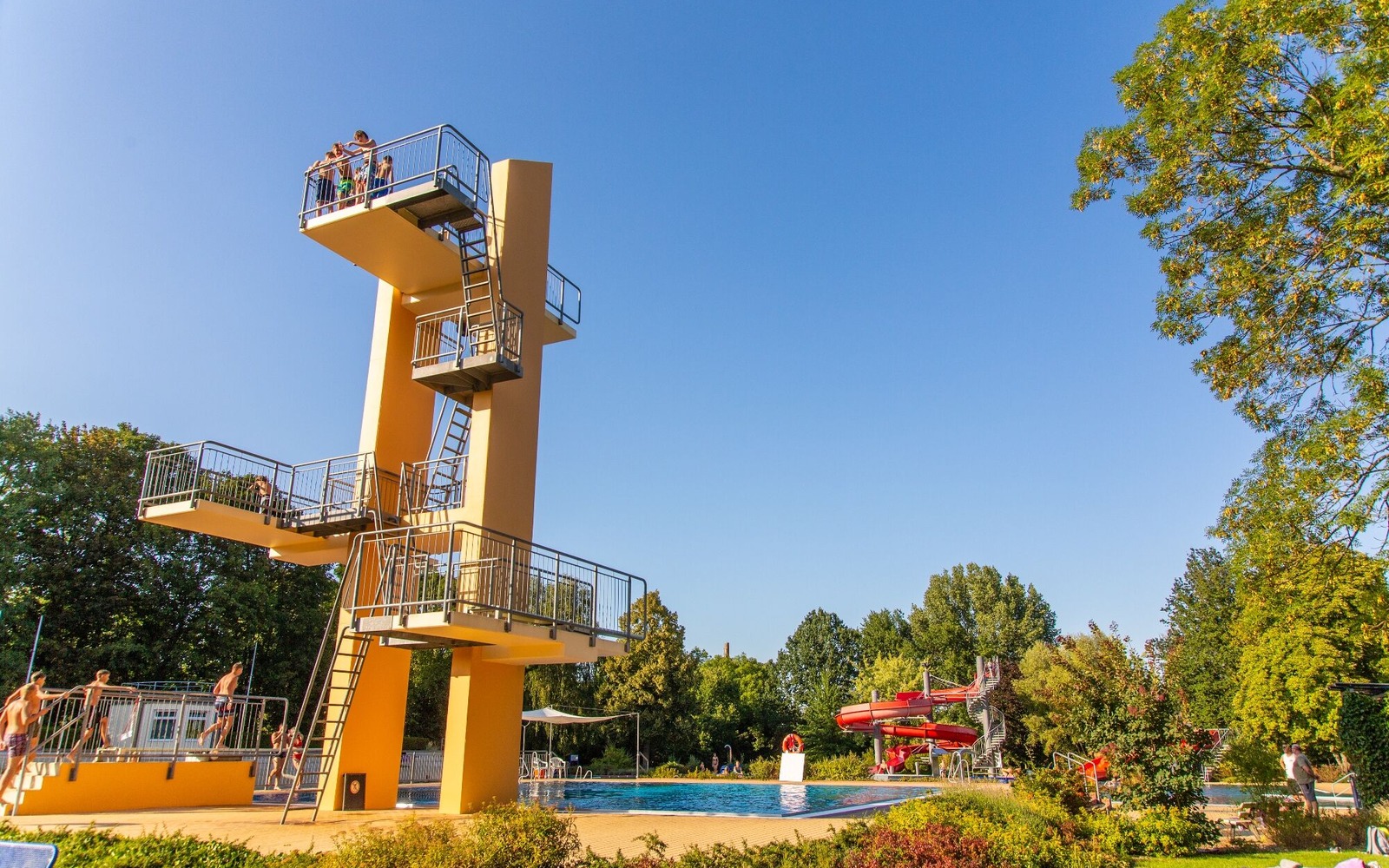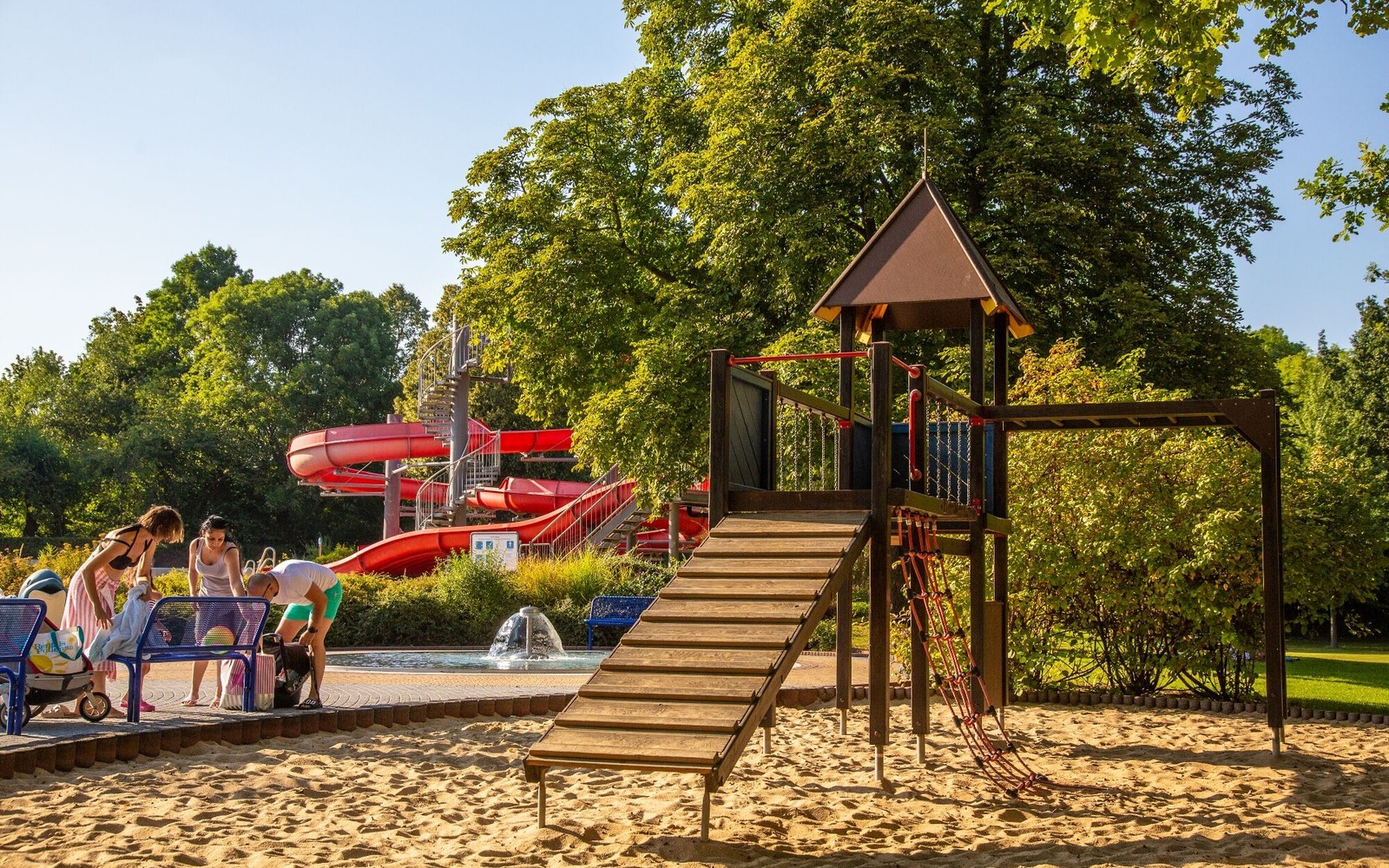 The sports and adventure open-air pool in Forst (Lausitz) is an attractive destination for guests of all ages. The open-air swimming pool features a number of different pools for children and grown-ups. Kids enjoy the wide water slide, splash showers, floor jets and water mushroom in the non-swimmer pool. For grown-ups, there are massage loungers and a swimming pool with six 50 metre lanes. Those who are not scared of heights can use the 1, 3, 5 and 10 metres tall diving towers. For the youngest guests, there are two paddling pools with a water hedgehog, water spout and a little slide hill. A sandy playground for children and leisure sports facilities cater for those who prefer to stay on land. Guests can let off some steam playing football, handball, basketball, volleyball or table tennis and then relax on the big sunbathing lawn.