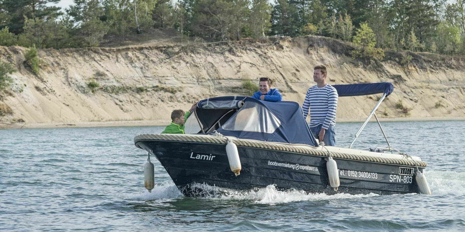 Tom faces into the wind and wipes some spray from his forehead as he keeps a keen lookout at the bow. “All clear,” the eight-year-old calls to his dad, who is at the helm. Mum quickly puts the picnic basket away and enjoys the views of the shore. The family head off in their motorboat from the Hafencamp campsite in Grosskoschen towards Senftenberg marina. Their boat, the ‘Lamir’, has a 15 hp motor which means it can be used without a licence. “It’s easy as long as you take care and use your common sense,” says Manuela Zahn, who hires out motorboats, among other things, at the Hafencamp campsite. Before starting a trip, guests are given a theoretical and practical briefing. How is the boat operated? What are the rules on the water? Which way am I going? She points to the linked lakes on a large map: starting at Lake Senftenberg, then passing though Koschen canal and on to Lake Geierswalde. The Barbara canal leads out even further to Lake Partwitz. To be on the safe side, there is a small map on board and some instructions for navigating the two canals.
