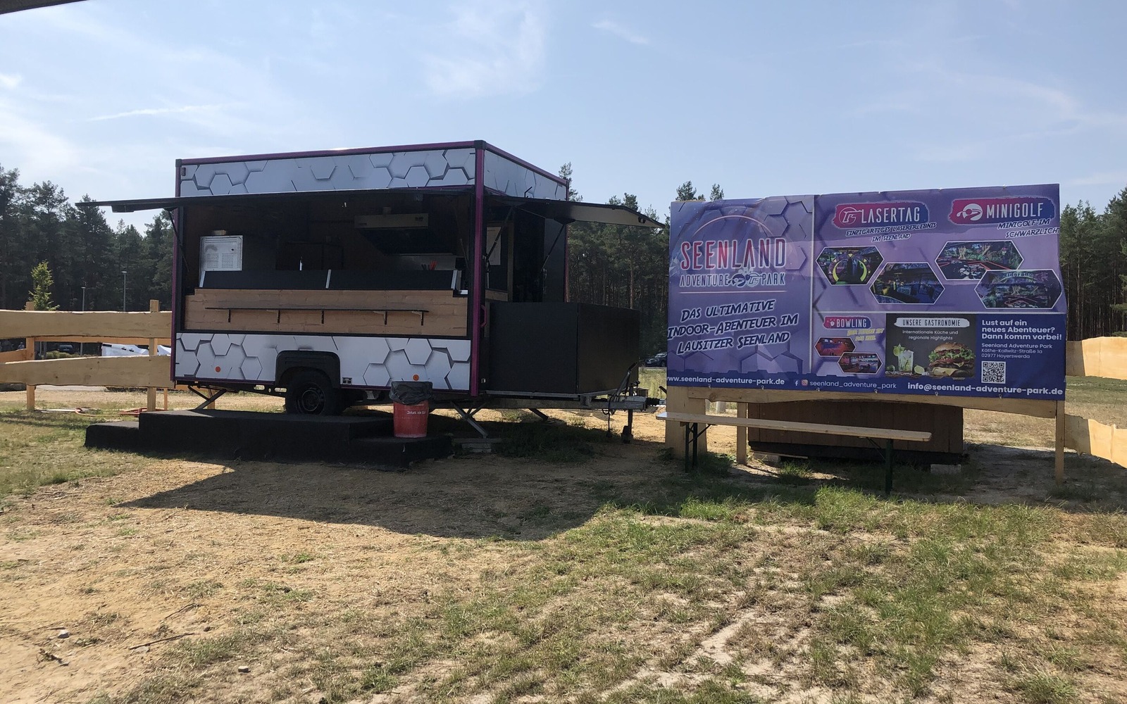Der Imbiss des Seenland-Adventure-Parks befindet sich oberhalb des Strandbereichs am Scheibe-See bei Hoyerswerda. In unmittelbarer Nähe befinden sich ein Parkplatz mit zusätzlichen E-Ladesäulen, der Seenrundweg und eine öffentliche barrierefreie mobile Toilette. In Sichtweite des Imbisswagens befindet sich außerdem ein neuer Spielplatz für die kleinen Gäste. Im Angebot sind neben kühlen Getränken auch herzhafte Speisen wie Currywurst, Bockwurst, Bratwurst oder Leberkäse mit Brötchen oder Nudelsalat erhältlich. Besucher sollten beachten, dass der Imbiss nur in der Sommersaison bei schönem Wetter ab Mittag geöffnet ist.