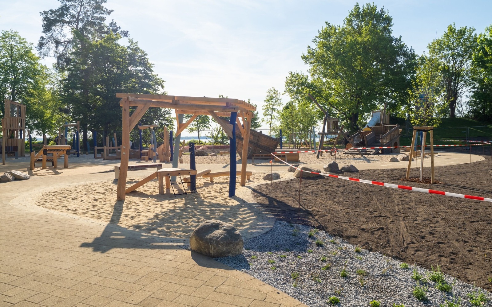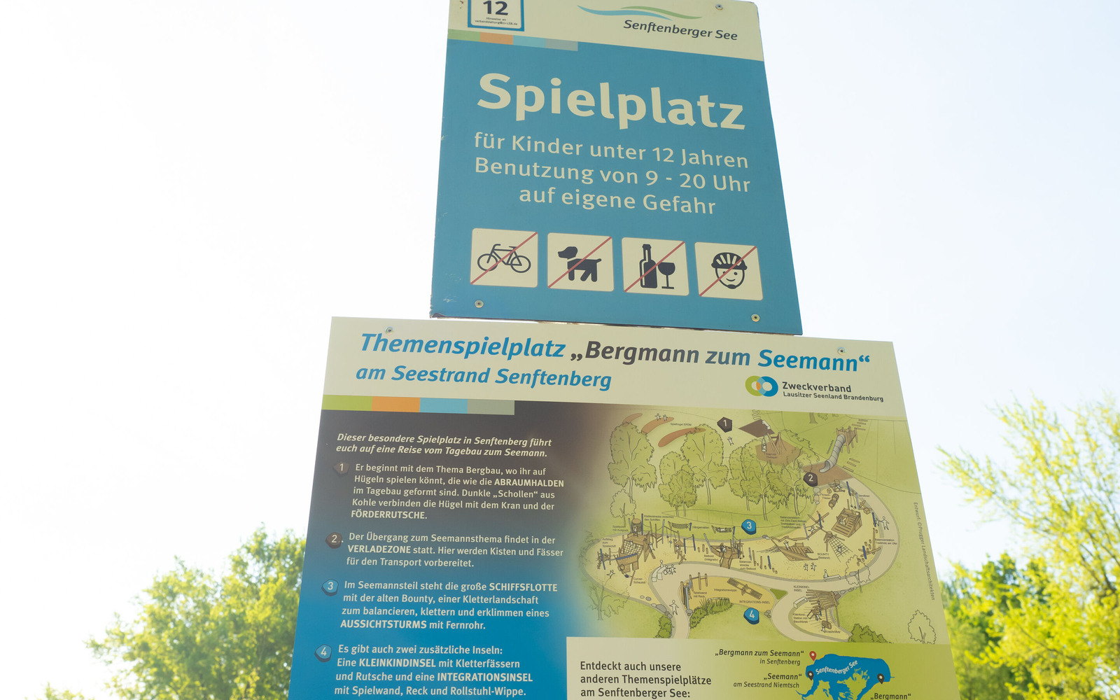 Direkt am Uferweg nahe des Gaumensegels bietet der neugestaltete Themenspielplatz in Senftenberg vielfältige Spielmöglichkeiten mit maritimen und bergbaulichen Bezügen. Im Mittelpunkt steht das bekannte Spielschiff „Bounty“, das neu aufgearbeitet und farblich überarbeitet in die Anlage integriert wurde. Eine ergänzende Flotte, neue Kletterelemente wie Holzfässer sowie eine Seilbahn mit Seeblick erweitern das Angebot. Kleine Hügel symbolisieren Abraumhalden und schlagen thematisch den Bogen vom ehemaligen Tagebau zum heutigen Seenland. Der bestehende Rapunzelturm mit Rutsche bleibt ebenso erhalten wie der benachbarte Rodelhügel. Der Spielplatz verfügt über einen integrativen Bereich und ist durch barrierearme Wege auch mit Kinderwagen oder Rollstuhl gut zugänglich. Mehrere große Findlinge erinnern an Dr. Otto Rindt, einen der maßgeblichen Gestalter des Lausitzer Seenlandes. Der nächste Badestrand liegt nur wenige hundert Meter entfernt östlich des Spielplatzes.