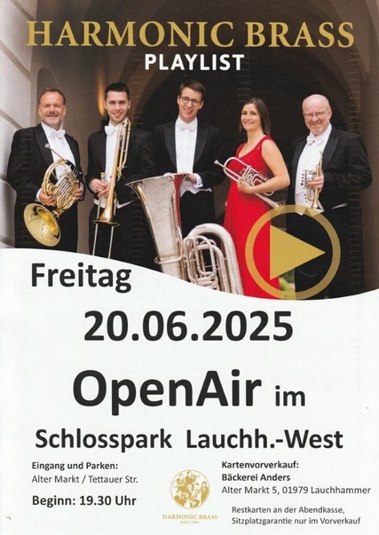 Erleben Sie einen unvergesslichen Abend im malerischen Schlosspark Lauchhammer-West! Das Open-Air-Konzert mit der renommierten Band "Harmonic Brass" verspricht musikalische Highlights in entspannter Atmosphäre. Genießen Sie die klangvolle Darbietung der Brass-Profis und lassen Sie sich von der einzigartigen Stimmung im Freien verzaubern.