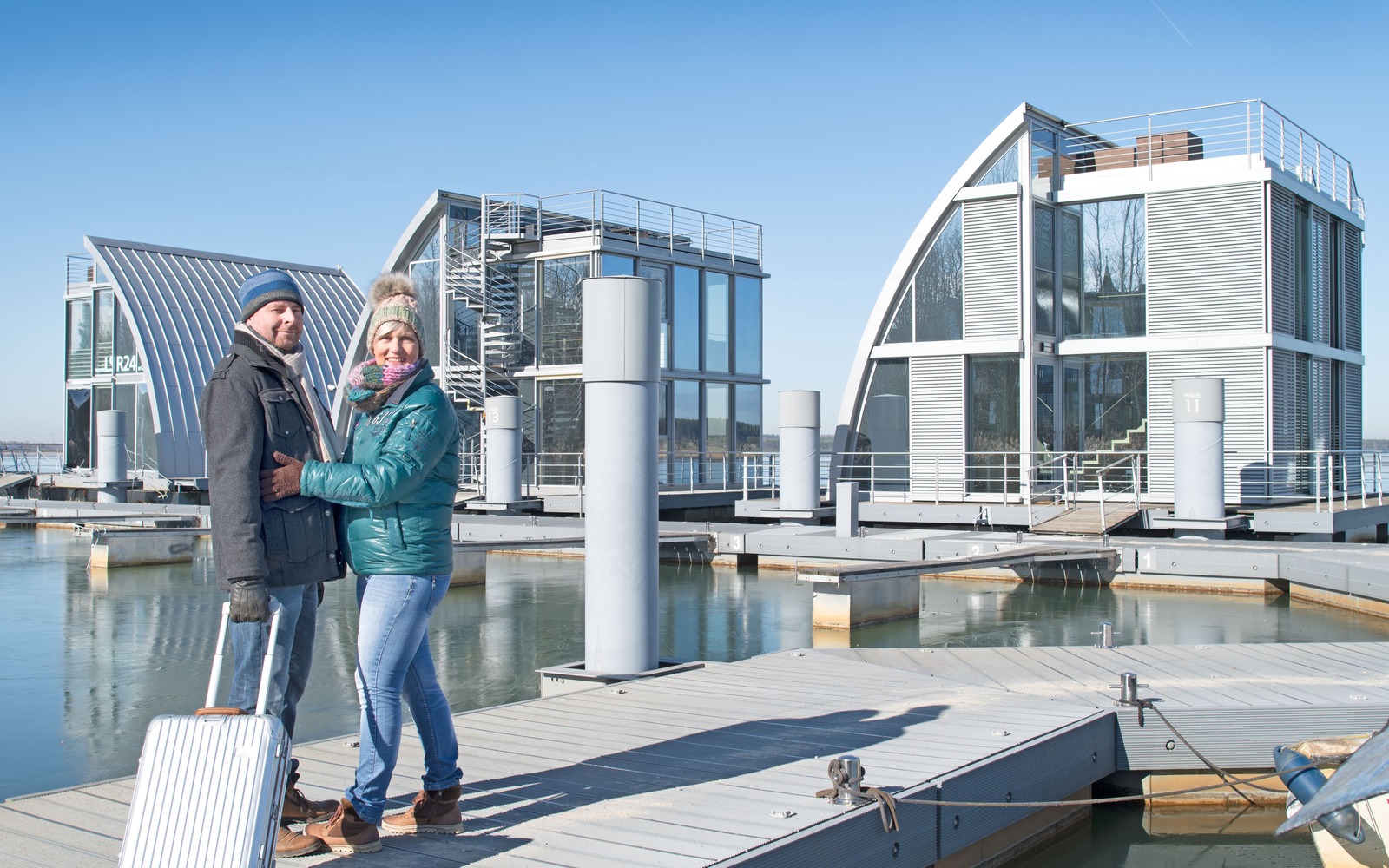 Das Wasser nicht nur sehen, sondern auch spüren können die Bewohner der schwimmenden Ferienhäuser im Lausitz Resort, wenige Meter vom Leuchtturm-Hotel entfernt. Die Ferienhäuser auf unsinkbaren Pontons bieten Platz für zwei bis acht Gäste. Auf der Terrasse oder dem Sonnendeck fühlt man die sanften Bewegungen des Sees und genießt bei Tee oder Glühwein die Stille, die Weite und die Wintersonne. Auch am Partwitzer See und am Gräbendorfer See gibt es schwimmende Häuser.