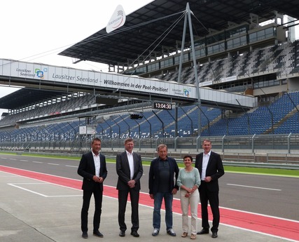 Bildunterschrift Foto Nr. 1 (v. l. n. r.): Klaus Prietzel, Vorstand Förderverein Lausitz Ring e.V. und Bürgermeister Gemeinde Schipkau, Siegurd Heinze, Mitglied Förderverein Lausitz Ring e.V., Landrat Landkreis Oberspreewald-Lausitz und Vorstandsvorsitzender Tourismusverband Lausitzer Seenland e.V., Josef Meier, Geschäftsführer der EuroSpeedway Verwaltungs GmbH, Kathrin Winkler, Geschäftsführerin Tourismusverband Lausitzer Seenland e.V. und Andreas Fredrich, Vorstand Förderverein Lausitz Ring e.V. und Bürgermeister Stadt Senftenberg freuen sich über die prominente Werbefläche für das Lausitzer Seenland am Lausitzring