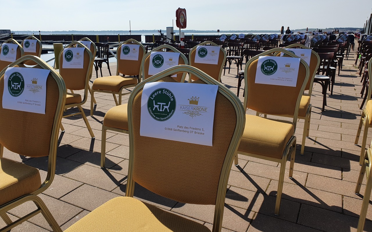 Aktion Leere Stühle macht auf die Notlage der Gastronomen, Hoteliers und Veranstalter im Lausitzer Seenland aufmerksam