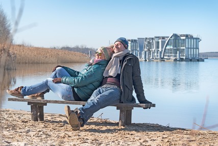Foto Paar im Winter am Strand am Geierswalder See im Hintergrund schwimmende Häuser©Tourismusverband Lausitzer Seenland, Nada Quenzel (JPG; 2,40 MB)