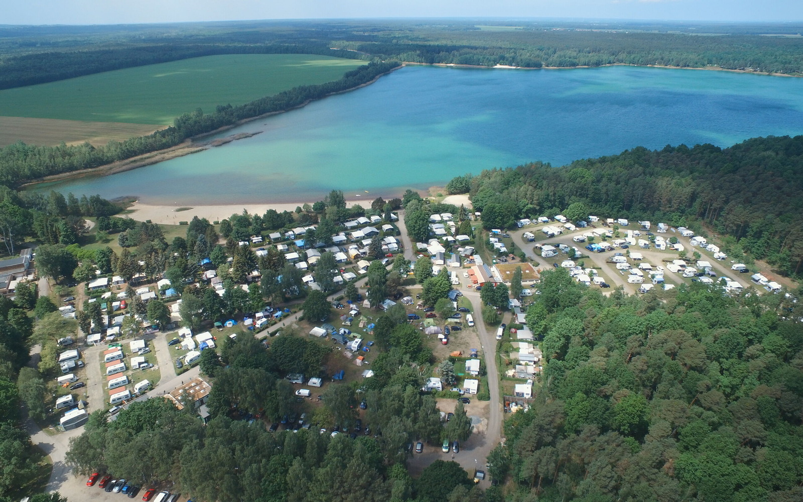 Situated in wooded and quiet surroundings on the edge of the "Niederlausitzer Heidelandschaft" nature park, the campsite offers spacious plots for a relaxing holiday by the lake. The site has around 100 tourist pitches for motorhomes, caravans or tents, and mobile homes, bungalows, holiday flats, PODs or Finnish barrel huts can also be rented. A modern, fully equipped separate site with 50 pitches and electricity is available for motorhomes.