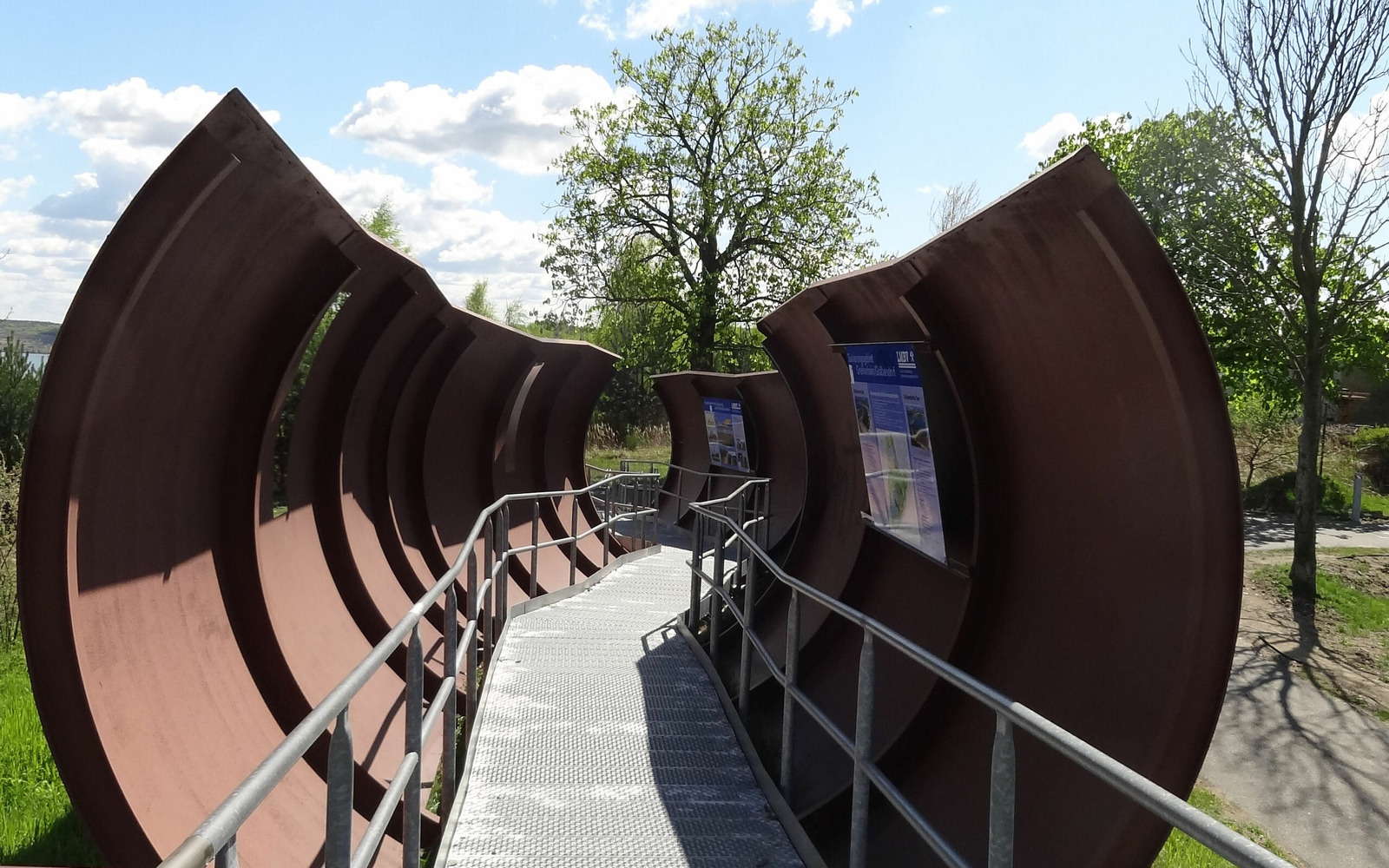 The viewpoint “Randriegel” by the lake Altdöberner See, is a memorial to the region’s mining past and it allows for unobstructed views of the lake that is currently being flooded. The viewpoint’s design resembles an oversized type of drainpipe that is used in surface mining and called a “Randriegel” in German. Inside the pipe, there are information panels about the drainage process, the restructuring work that visitors can experience and the development of the lake Altdöberner See.