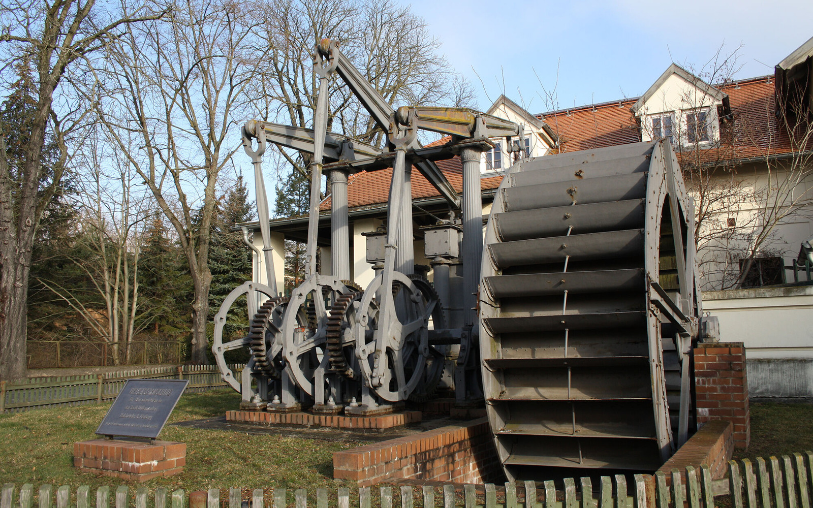 The balancing cylinder blowing machine at the entrance to the Werkhof was manufactured in Lauchhammer in 1837 for a smelting works in Saxony. The 30-ton technical monument was returned to Lauchhammer in 1929. Then as now, the machine impresses with its huge swinging levers and the water wheel with a diameter of 4.40 meters.
