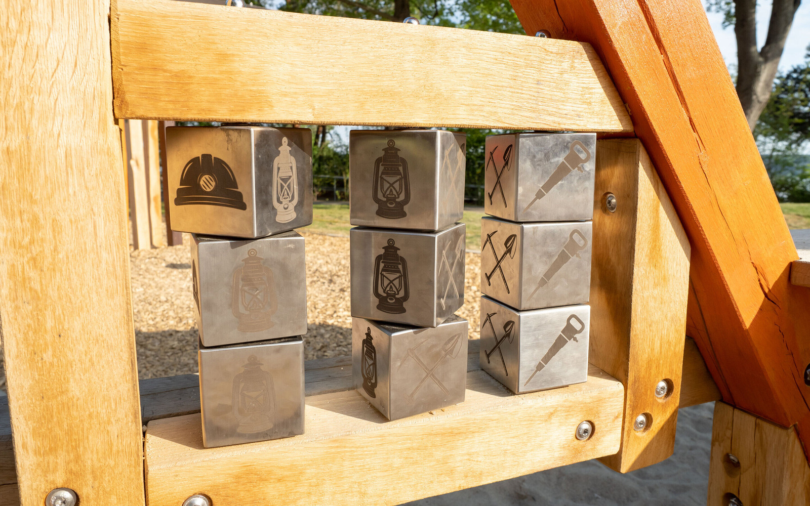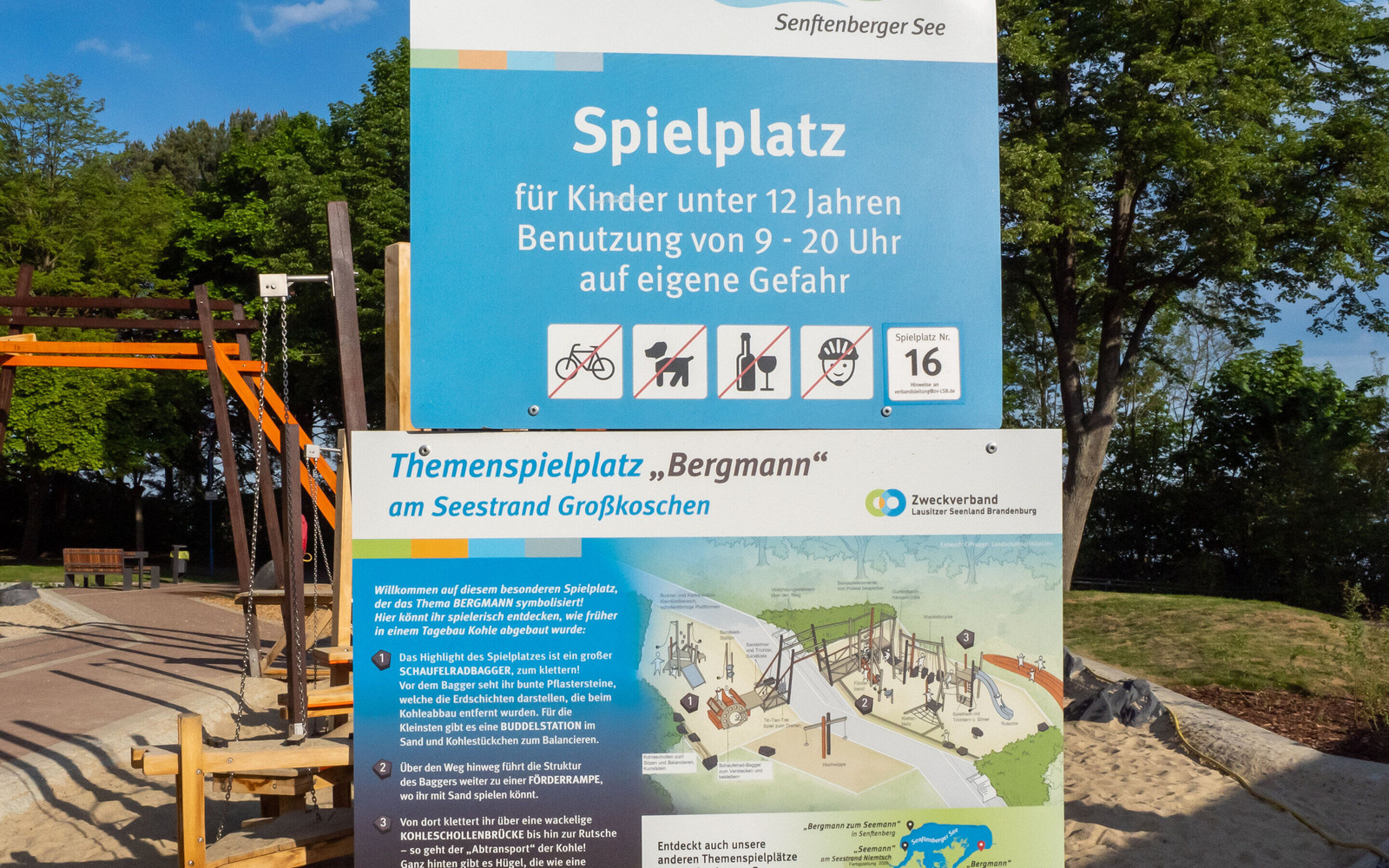 The newly designed playground at the Großkoschen lakeside beach is an exciting place where children up to the age of 12 can discover the mining history of Lusatia through play. Under the motto ‘Miner’, the facility incorporates key elements of former open-cast lignite mining in Lusatia. The highlight is a large bucket wheel excavator that can be climbed on. The offer is complemented by a conveyor ramp with a digging station, a wobbly coal slab bridge and a slide that recreates the removal of the coal. The design of the site is also reminiscent of open-cast mining: mounds in brown symbolise spoil heaps. The playground brings the structural change in the region to life in a child-friendly way.