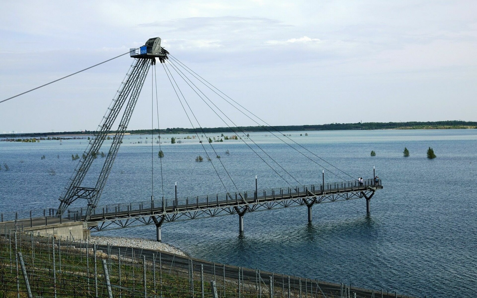 Lake Grossräschen is one of ten lakes at the heart of the Lusatian Lakeland that will eventually be linked by canals. Development of the lake’s tourism infrastructure has been going on for a few years now, resulting in the IBA Terraces and the Seehotel. Lake Grossräschen has been flooded since 2007 and reached its final level in 2024. The IBA Terraces, a recipient of the Brandenburg prize for architecture, offer panoramic views of the lake, the marina and the pier. Grossräschen marina was built when the area was still above the water level.